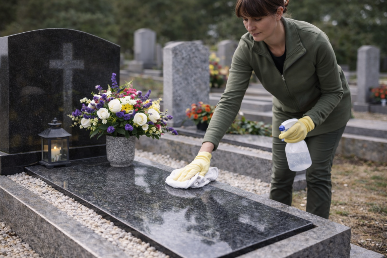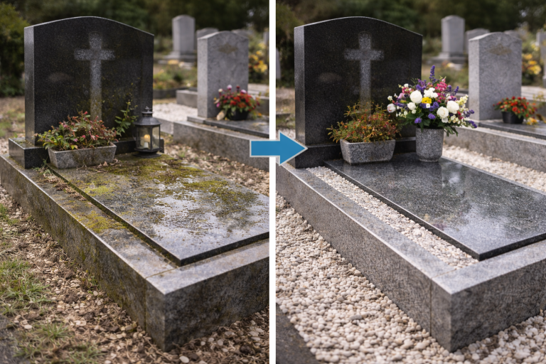 - Nettoyage de la pierre tombale, des plaques commémoratives, statues et éléments décoratifs, enlèvement des salissures